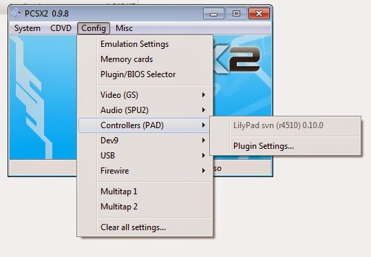 3. Selanjutnya pilih menu CONFIG >> CONTROLLERS (PAD) >> PLUGIN SETTINGS... >> PAD 1